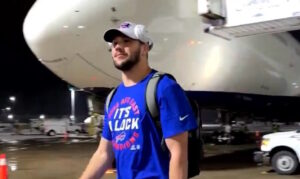 Josh Allen gets off the plane from Miami early Monday morning and looks up to see a huge crowd of Bills fans cheering from the
