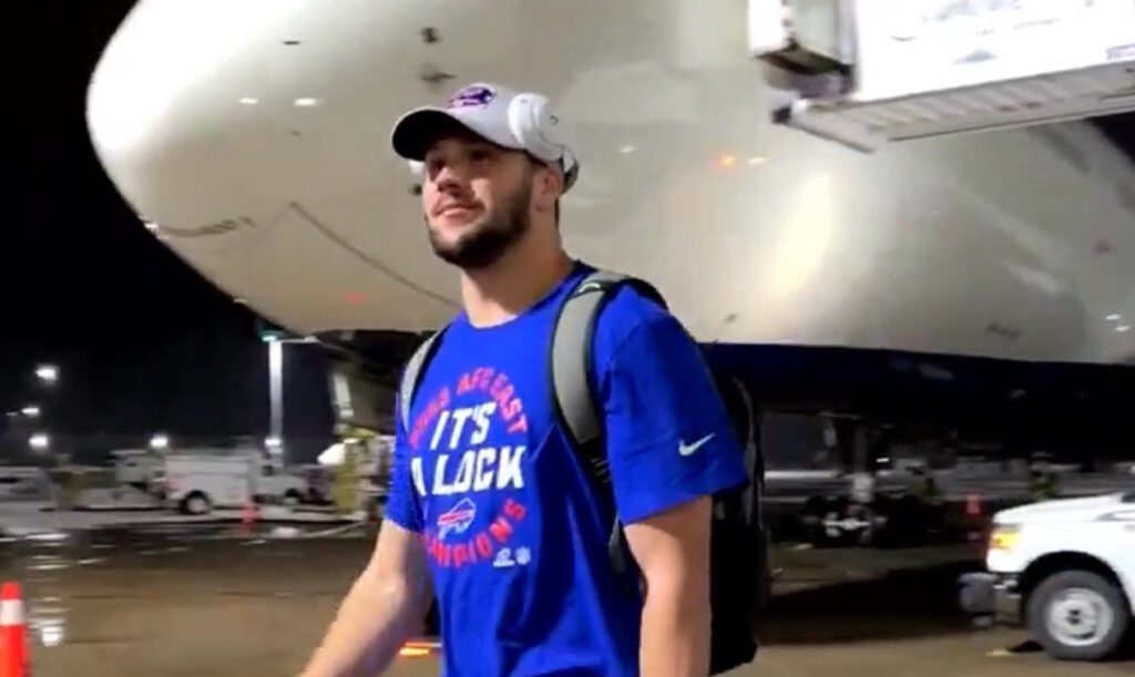 Josh Allen gets off the plane from Miami early Monday morning and looks up to see a huge crowd of Bills fans cheering from the fence.