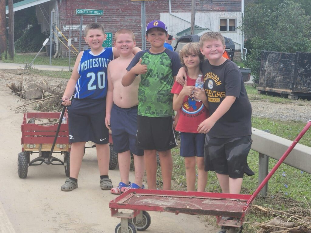 They have been out early mornings every day since Friday August 9th voluntarily and eagerly doing anything from helping clear storm drains with adults, clearing rocks, shoveling mud out of a basement and helping remove mud heavy debris.