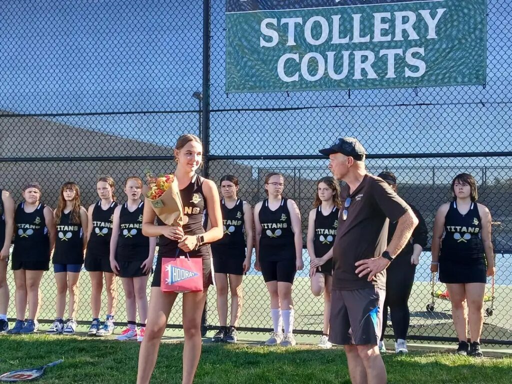 (Photo of Avoca-Prattsburgh tennis coach Bill Stollery honoring Senior Leni Wollschlaeger)