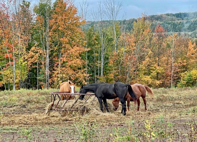 I begin this week with the Murat’s elegant horses with the scenic fall foliage as a backdrop in Bath, NY. Then a Carolina wren, a sparrow & a young female cardinal enjoying our bird seed, and a foggy roadside view of autumn beauty as a NS train passes by in Addison. Next a perky little chipmunk, and last night’s view of the Canisteo River framed by the vibrant red foliage here in Cameron Mills. I end with a female downy woodpecker delight.