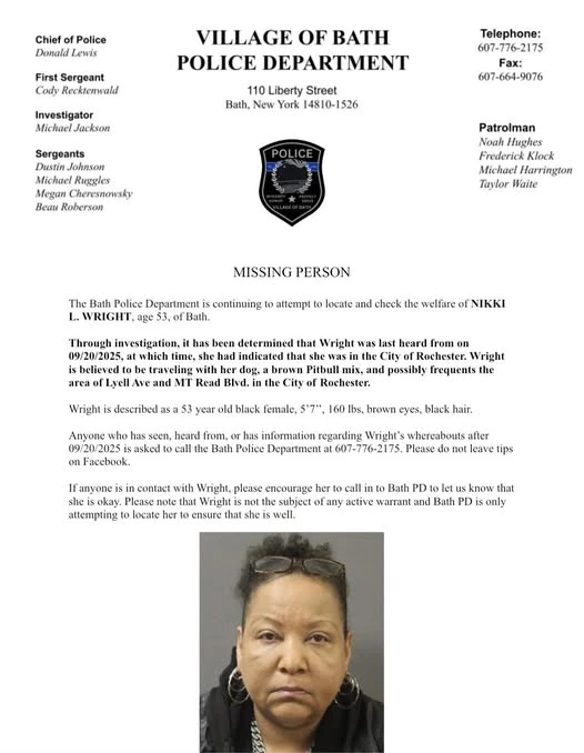 Anyone who has seen, heard from, or has information regarding Wright’s whereabouts after 09/20/2025 is asked to call the Bath Police Department at 607-776-2175. Please do not leave tips on Facebook.
