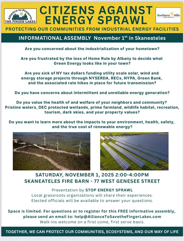 Alliance to Preserve the Finger Lakes and Southern Hills Wind Watch, Skaneateles, NY Citizens against utility-scale wind and solar power generation plants will assemble in Skaneateles, NY, on November 1, 2025, at the Skaneateles Fire Barn from 2:00–4:00 p.m. to address New York State’s unrealistic climate goals and the reclaiming of home rule to protect our communities, farmland, woodlands, wetlands, pristine water bodies, and property values, and to prevent harm to our environment and ecosystems. Local elected representatives will be available to answer questions. The event is free to the public, and pre-registration is recommended.