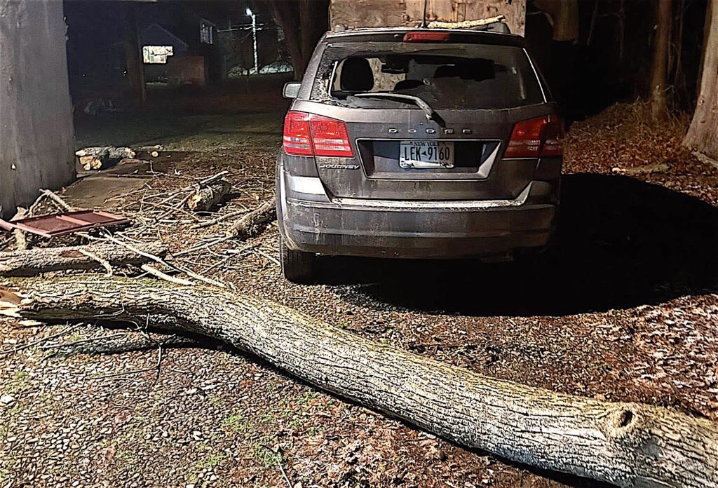 “You always think something like that won’t happen to you,” McDonald said. “When the tree hit the top of the car — like a magnet to a refrigerator, perfectly — it set the lights off. The back windshield was shattered out and there are dents and damage all over the car. The tree also took the door handle right off. The tree also knocked over and broke shutters on the door to the entryway of the house.”