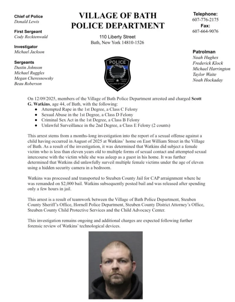 This arrest stems from a months-long investigation into the report of a sexual offense against a child having occurred in August of 2025 at Watkins’ home on East William Street in the Village of Bath. As a result of the investigation, it was determined that Watkins did subject a female victim who is less than eleven years old to multiple forms of sexual contact and attempted sexual intercourse with the victim while she was asleep as a guest in his home. It was further determined that Watkins did unlawfully surveil multiple female victims under the age of eleven using a hidden security camera in a bedroom.