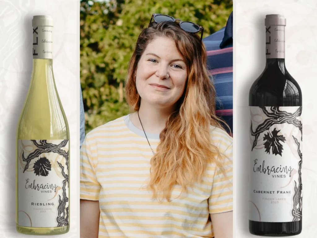 The Embracing Vines design incorporates wine stains, grape vines, and a leaf embedded with the outlines of the Finger Lakes. Lauren said the design is intended to represent the collaborative, interconnected work of the viticulture students while highlighting the close community ties of the Finger Lakes wine region.