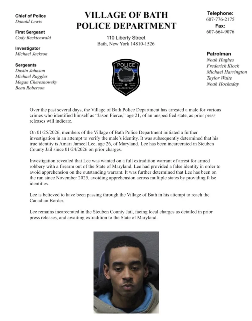 On 01/25/2026, members of the Village of Bath Police Department initiated a further investigation in an attempt to verify the male’s identity. It was subsequently determined that his true identity is Amari Jameel Lee, age 26, of Maryland. Lee has been incarcerated in Steuben County Jail since 01/24/2026 on prior charges.