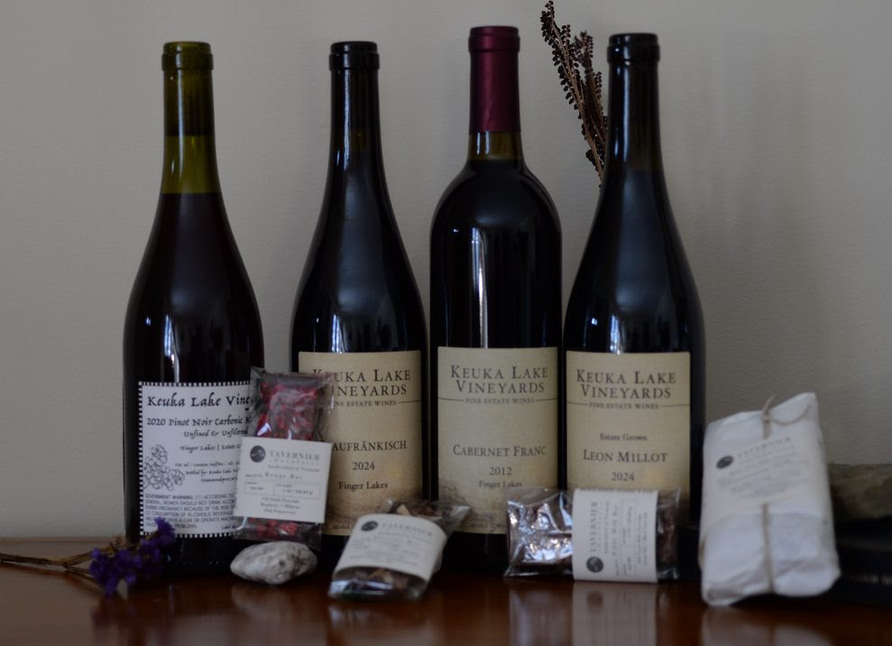 Your tasting kit includes a full bottle of 2024 Blaufränkisch, plus sample bottles of 2020 Pinot Noir, 2012 Cabernet Franc, and 2024 Leon Millot, each thoughtfully paired with a selection of Tavernier chocolate bars.