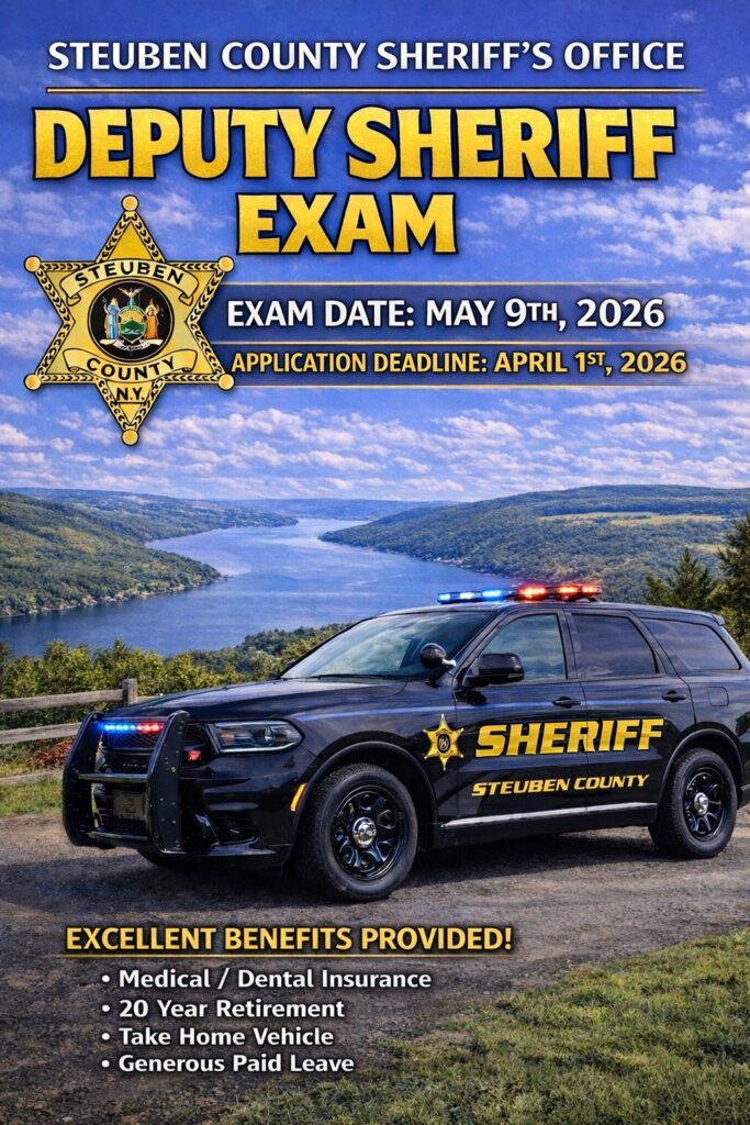 For more details on the Deputy Sheriff exam – including residency and special requirements, exam information, and the application process click here —> https://www.steubencountyny.gov/DocumentCenter/View/8666/Deputy-Sheriff-?bidId=