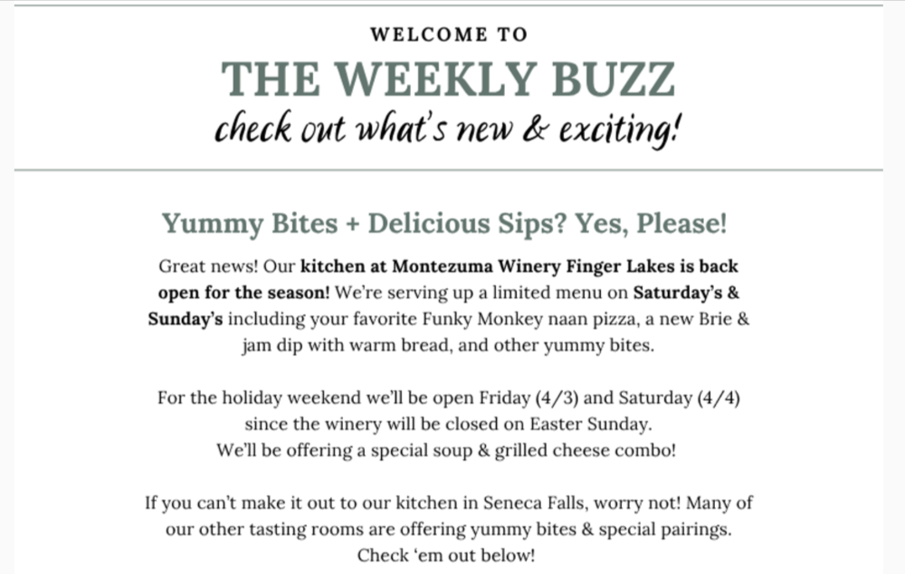 Great news! Our kitchen at Montezuma Winery Finger Lakes is back open for the season! We’re serving up a limited menu on Saturday’s & Sunday’s including your favorite Funky Monkey naan pizza, a new Brie & jam dip with warm bread, and other yummy bites.