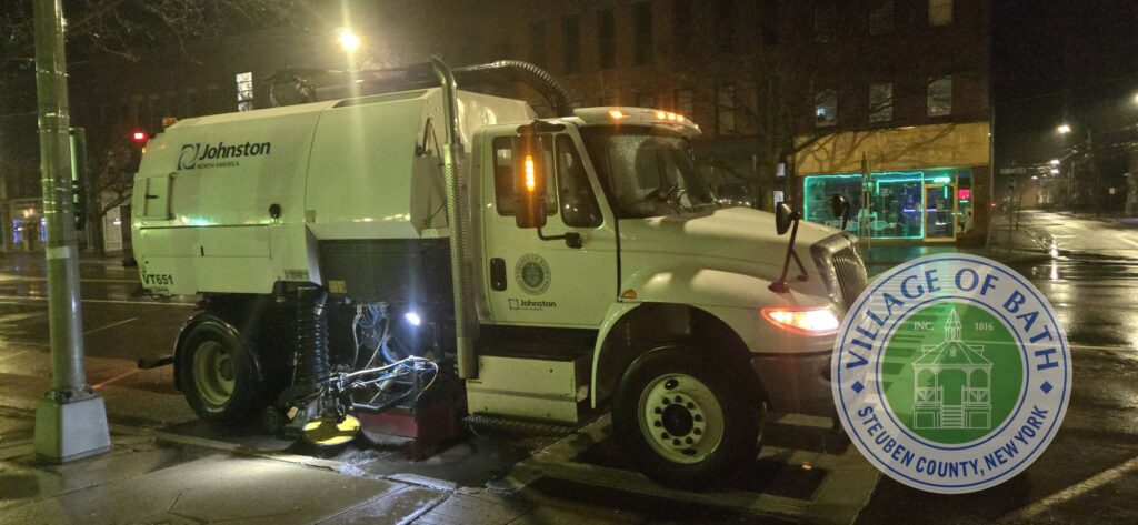 Notice to Village of Bath, New York & Town of Bath, New York residents and motorists, The Village of Bath, New York Street Department and the Town of Bath, New York Highway Department has commenced street sweeping operations within the Village & Town. Motorists are advised to exercise caution and reduce speed when approaching and navigating around the street sweeper, which operates at approximately 5 mph, although speed may decrease with heavier debris loads.