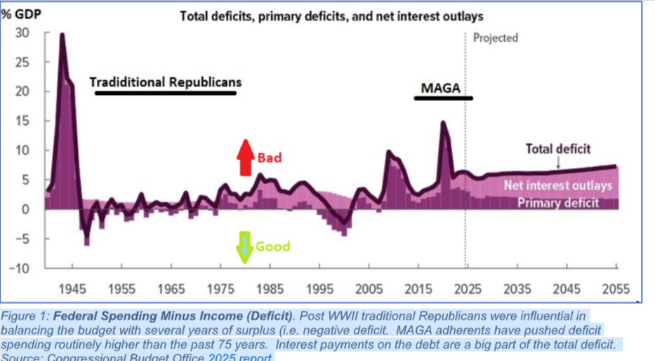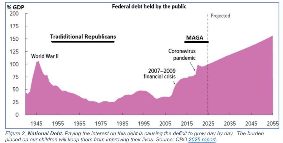Traditional Republicans participated in three decades of managing balanced budgets for an economy that boomed and raised the standard of living and sense of wellbeing for nearly all Americans, and simultaneously reduced the national debt. MAGA promises the same but is delivering the opposite.