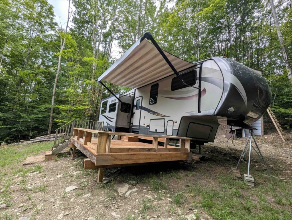 Escape to the peace and quiet of this wooded getaway featuring a fully functional campsite with an existing 31-foot Keystone Sprinter camper. Nestled in the woods, the property is accessed by a gravel driveway leading off a paved road and opens up to a private, established campsite overlooking a small meadow. The camper includes slide-outs for extra space and sits beside a deck perfect for relaxing and enjoying the natural surroundings.