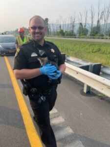 From the Steuben County Sheriff’s office, Patrol Division – Deputy Butler comforting a kitten after being rescued from a vehicle that was involved in a