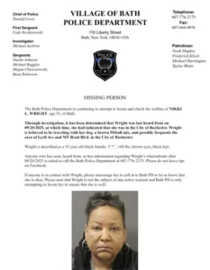 Bath Police / October 14, 2025 MISSING PERSON The Bath Police Department is continuing to attempt to locate and check the welfare of NIKKI L.