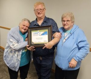 Gardner is a key member of the Stitched INK team From the Arc Allegany Steuben, pictured is Dave with neighbors at Lake View Apartments Bath,