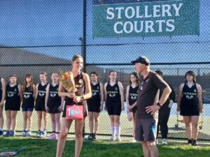 (Photo of Avoca-Prattsburgh tennis coach Bill Stollery honoring Senior Leni Wollschlaeger) By BILL COLLMER, Hornell Sun Senior Sports Writer We’re now at the midway point